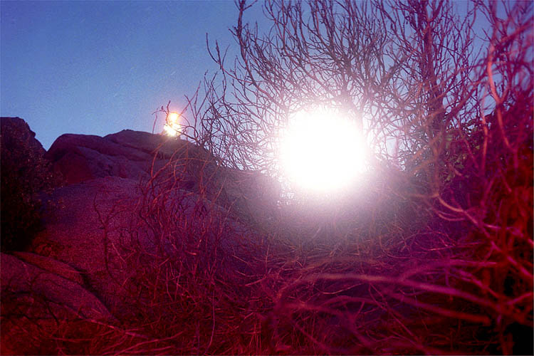the shrub brush. The red glow on landscape created by using a flash with a