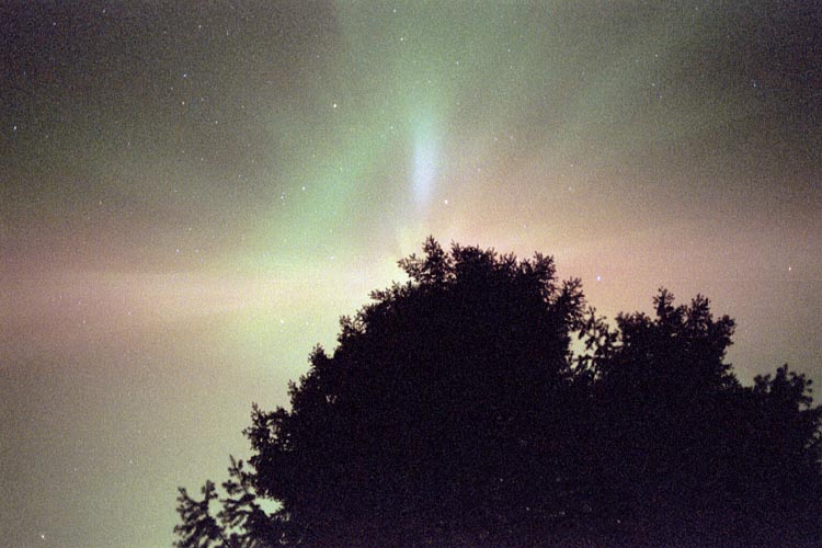 2004/01/25 brief auroral display at 01:00. The temp was around 0 degrees in Two Rivers, WI. This bright curtain shot across the horizon, and faded again 15 minutes later. I was lucky enough to be driving through a rural area with a camera & tripod handy. Canon G2 digital, ASA 400, f 2.0 for 15 sec.See more photos by: Peg Zenko |